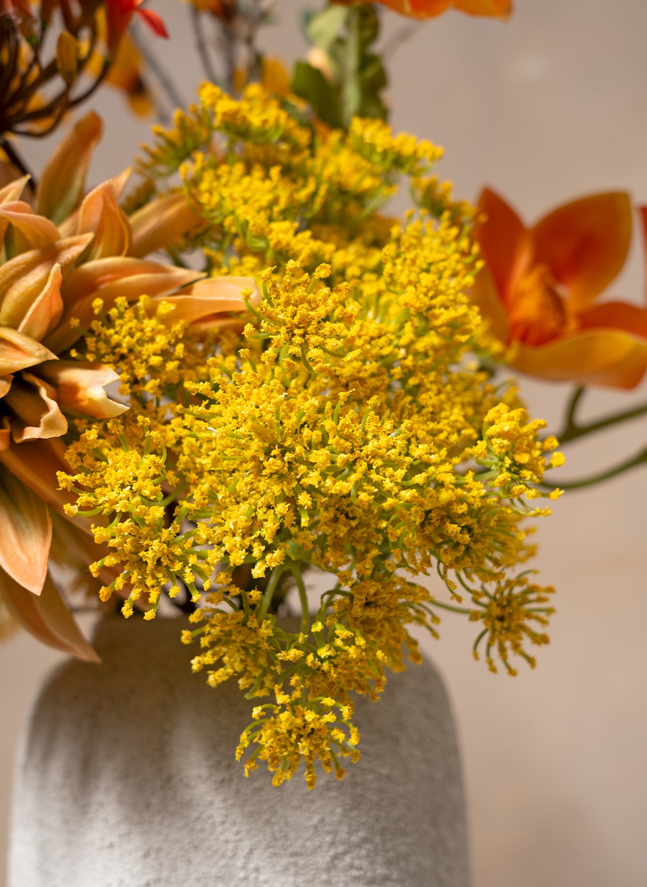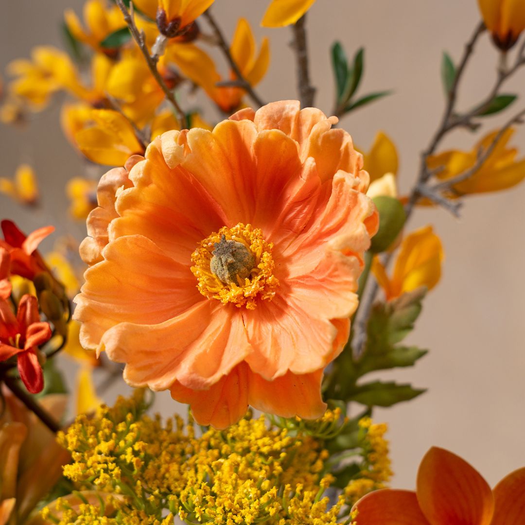Un bouquet automnal ensoleillé aux tons chauds d’orange et d’or, enrichi d’orchidées et de chrysanthèmes. Il rayonne d’énergie, de luxe et de convivialité.