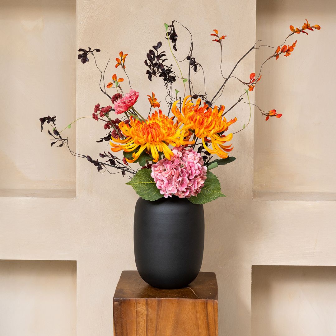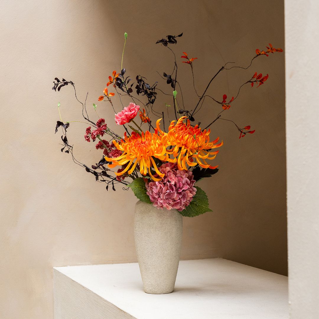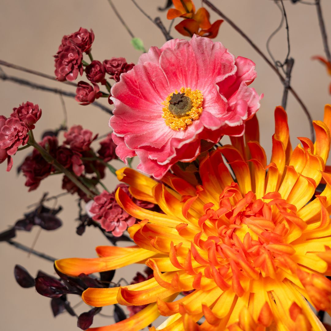 Un bouquet expressif et artistique avec de flamboyants chrysanthèmes orange, des accents roses et des branches légères. Une pièce maîtresse qui insuffle mouvement et caractère à chaque espace.