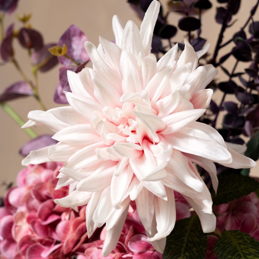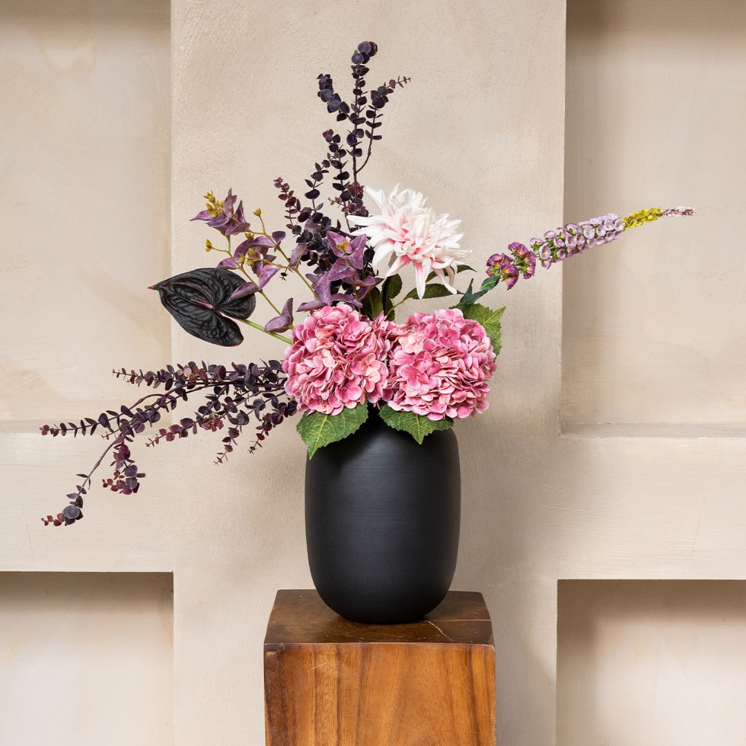 Ce bouquet composé associe de somptueuses hortensias roses à de profonds accents violets, avec une fleur dahlia élégante comme pièce maîtresse. Un arrangement raffiné qui apporte chaleur et élégance à tout intérieur.