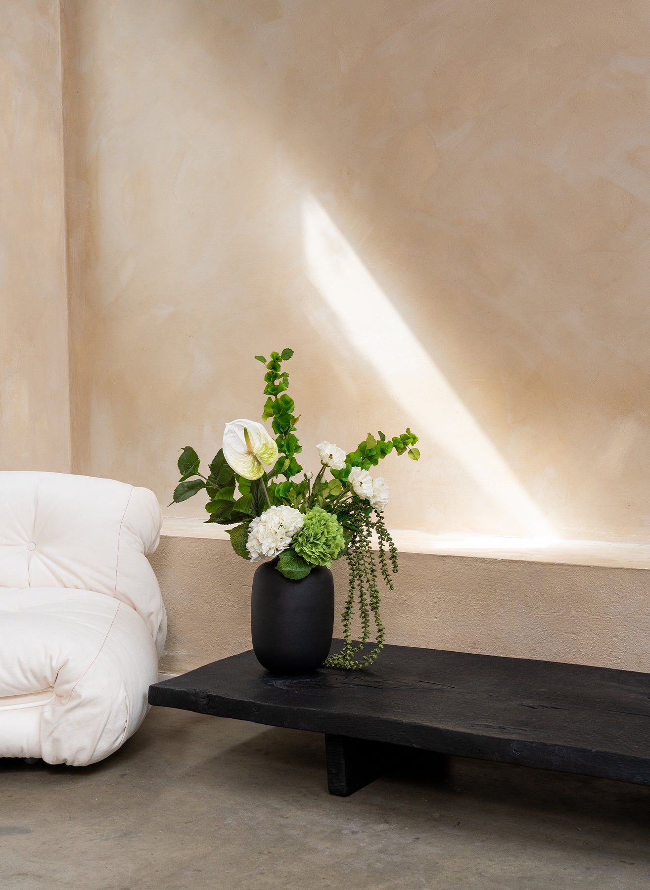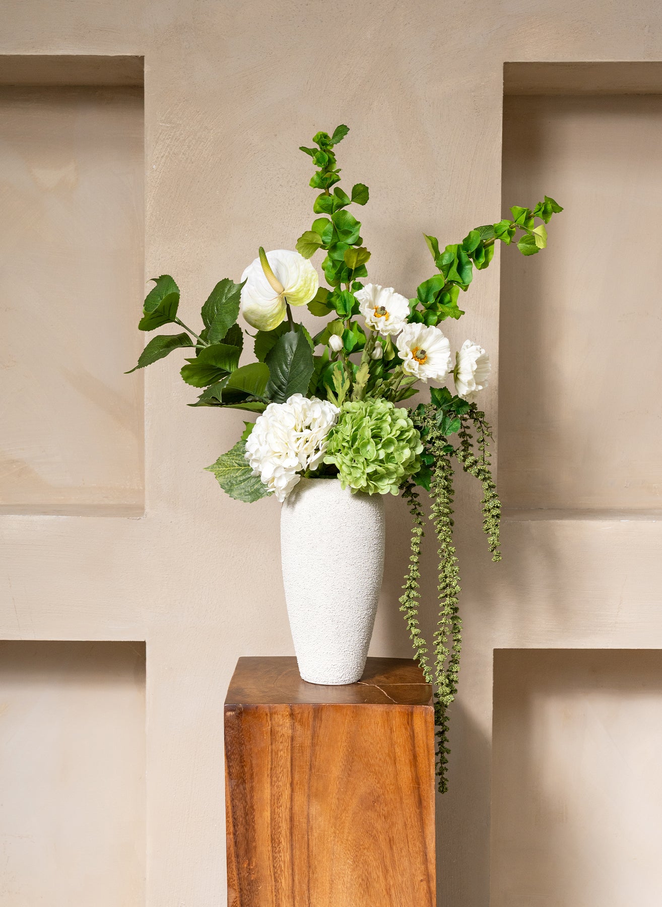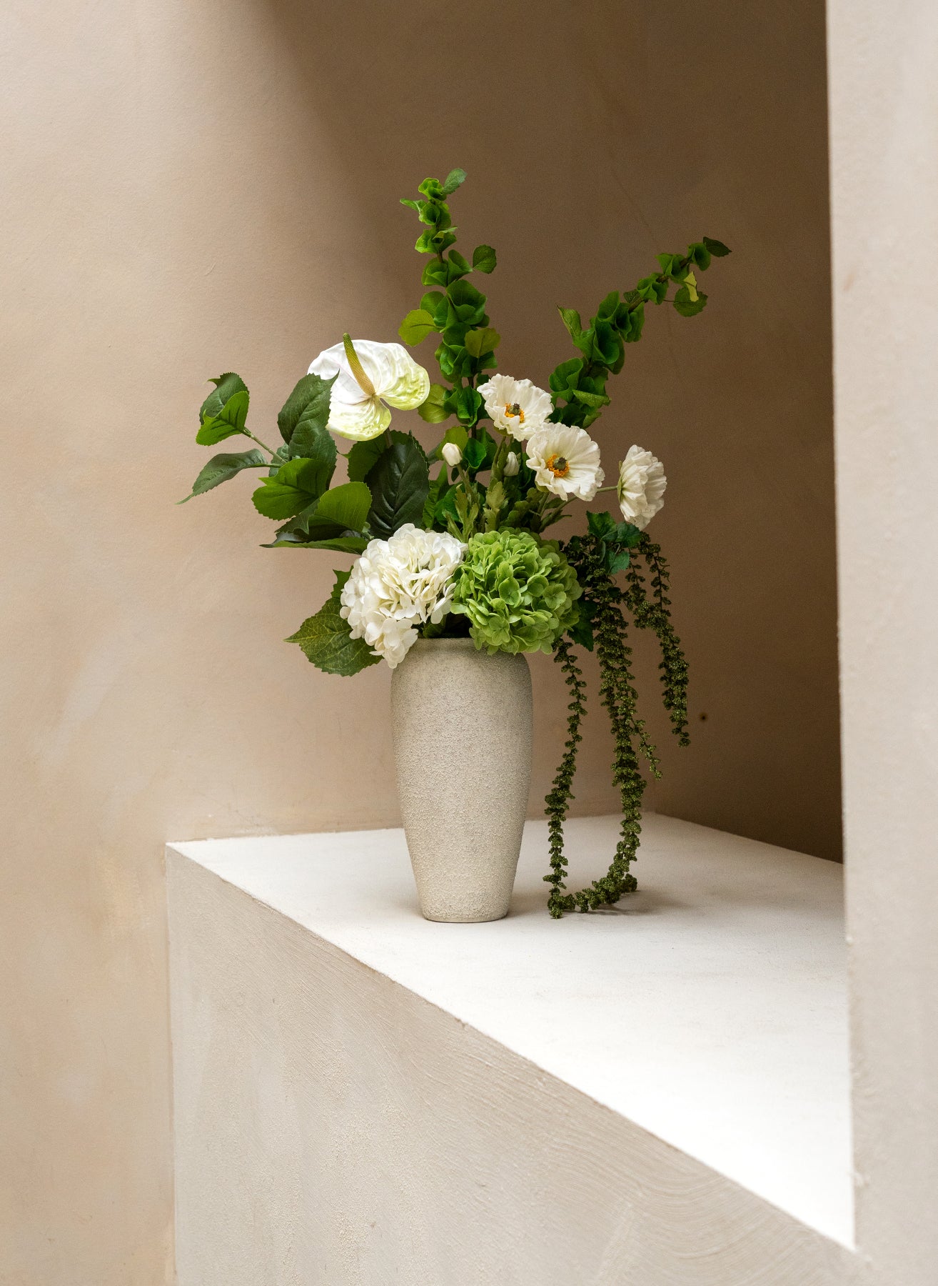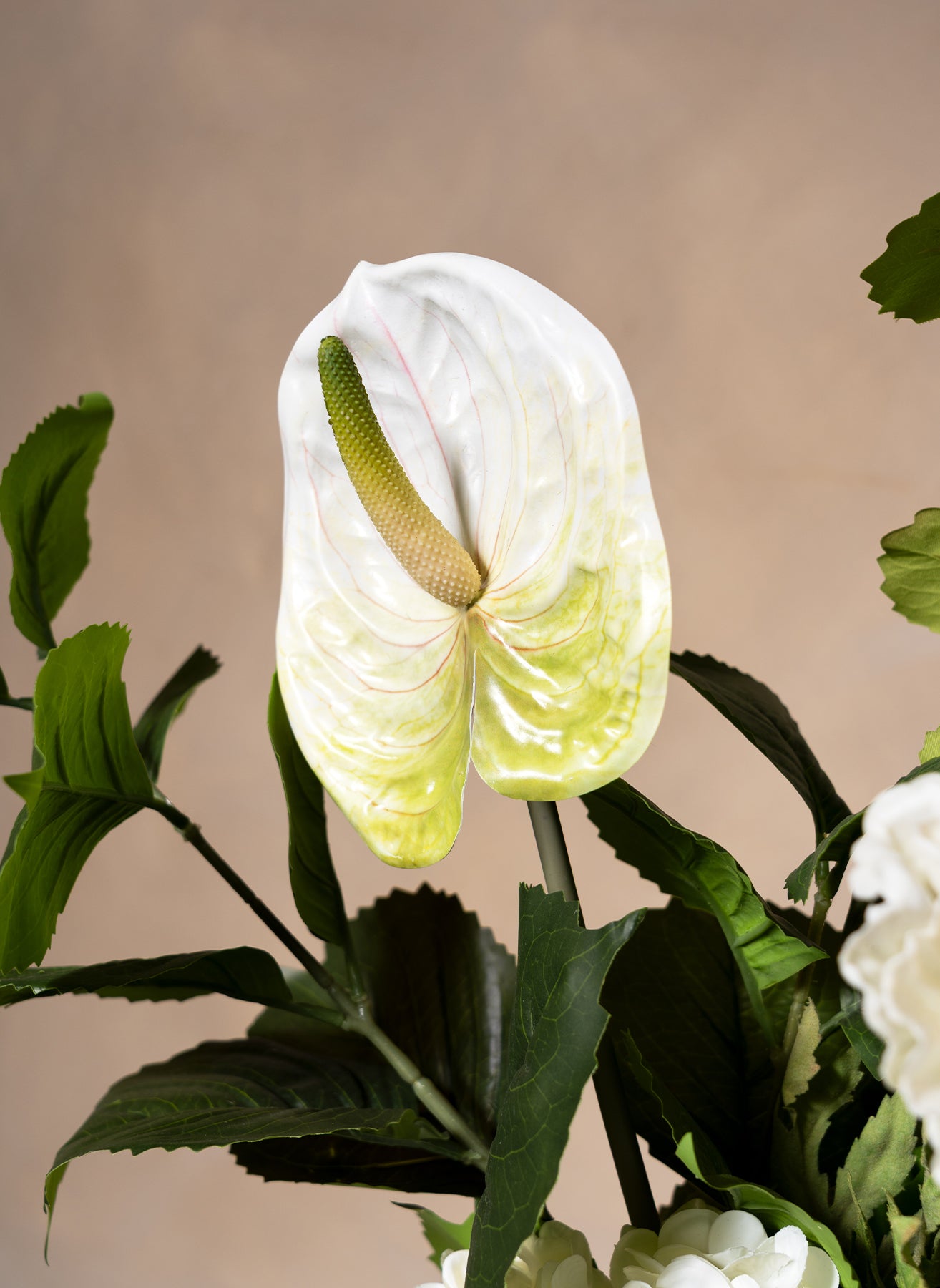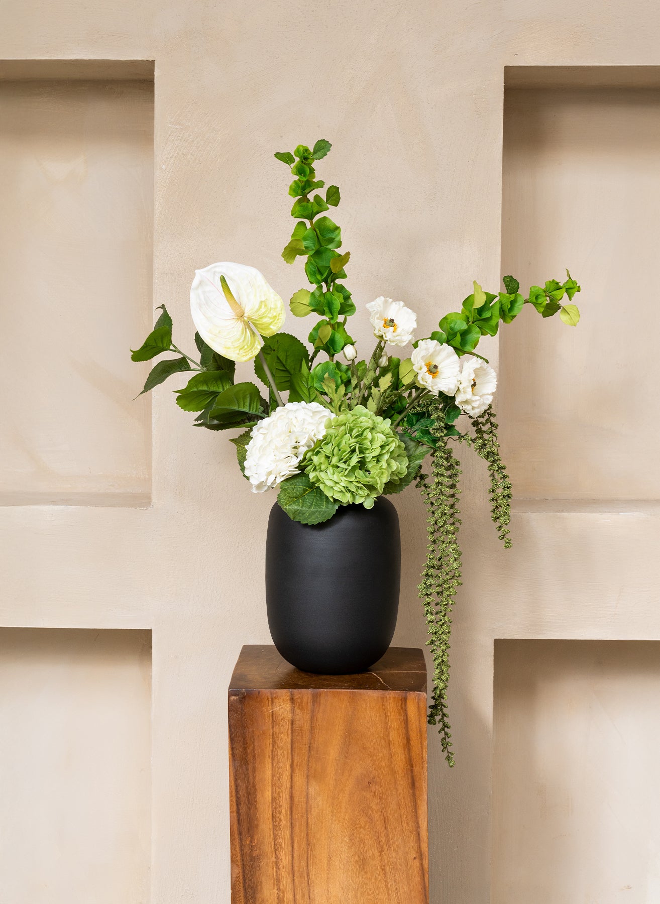Un bouquet pur et frais en blanc et vert, avec des anthuriums élégants et de délicates hortensias. Cet arrangement apporte calme, modernité et luxe naturel.